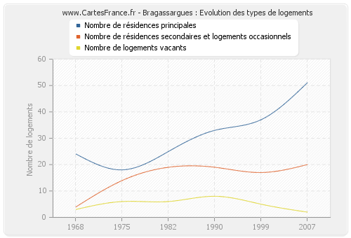 Les graphiques suivant reprennent l'historique du nombre et du type de logements de Bragassargues de 1968 à 2007. Le deuxième graphique est tracé en interpolation cubique. Ceci permet d'obtenir plus précisément le nombre de logement du village de Bragassargues les années ou aucun recensement n'a été effectué.