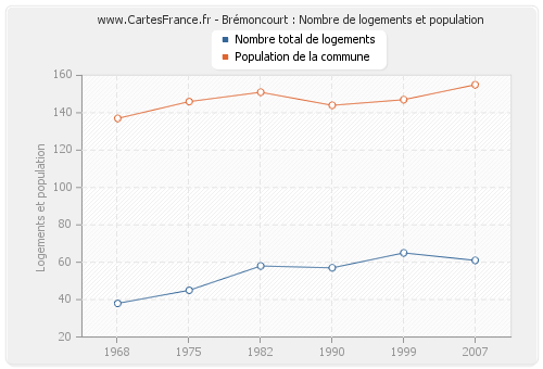 La population de Brémoncourt était de 155 habitants en 2007, 147 habitants en 1999, 144 habitants en 1990, 151 habitants en 1982, 146 habitants en 1975 et 137 habitants en 1968. Parallèlement, le nombre de logements de Brémoncourt était de 61 en 2007, 65 en 1999, 57 en 1990, 58 en 1982, 45 en 1975 et 38 en 1968.