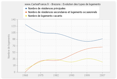 Les graphiques suivant reprennent l'historique du nombre et du type de logements de Brezons de 1968 à 2007. Le deuxième graphique est tracé en interpolation cubique. Ceci permet d'obtenir plus précisément le nombre de logement du village de Brezons les années ou aucun recensement n'a été effectué.