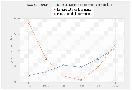 La population de Broissia était de 48 habitants en 2007, 37 habitants en 1999, 31 habitants en 1990, 33 habitants en 1982, 41 habitants en 1975 et 58 habitants en 1968. Parallèlement, le nombre de logements de Broissia était de 46 en 2007, 41 en 1999, 37 en 1990, 38 en 1982, 35 en 1975 et 33 en 1968.