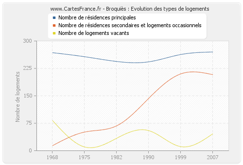 Les graphiques suivant reprennent l'historique du nombre et du type de logements de Broquiès de 1968 à 2007. Le deuxième graphique est tracé en interpolation cubique. Ceci permet d'obtenir plus précisément le nombre de logement du village de Broquiès les années ou aucun recensement n'a été effectué.