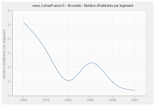 - Nombre d'habitants moyen par logement de Broxeele en 2007 : 2,35