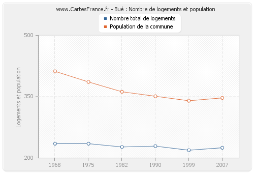 La population de Bué était de 347 habitants en 2007, 340 habitants en 1999, 351 habitants en 1990, 362 habitants en 1982, 386 habitants en 1975 et 412 habitants en 1968. Parallèlement, le nombre de logements de Bué était de 225 en 2007, 219 en 1999, 229 en 1990, 227 en 1982, 235 en 1975 et 235 en 1968.