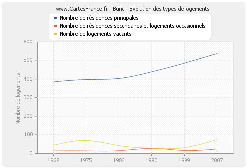 Les graphiques suivant reprennent l'historique du nombre et du type de logements de Burie de 1968 à 2007. Le deuxième graphique est tracé en interpolation cubique. Ceci permet d'obtenir plus précisément le nombre de logement du village de Burie les années ou aucun recensement n'a été effectué.