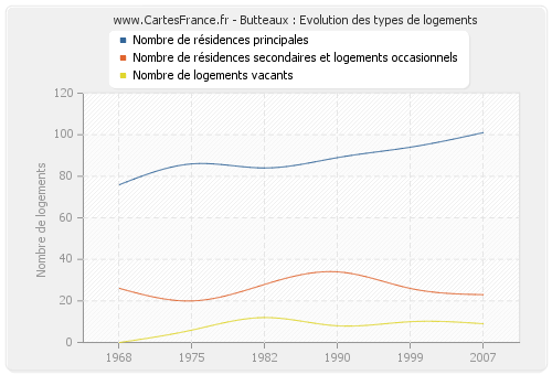 Les graphiques suivant reprennent l'historique du nombre et du type de logements de Butteaux de 1968 à 2007. Le deuxième graphique est tracé en interpolation cubique. Ceci permet d'obtenir plus précisément le nombre de logement du village de Butteaux les années ou aucun recensement n'a été effectué.