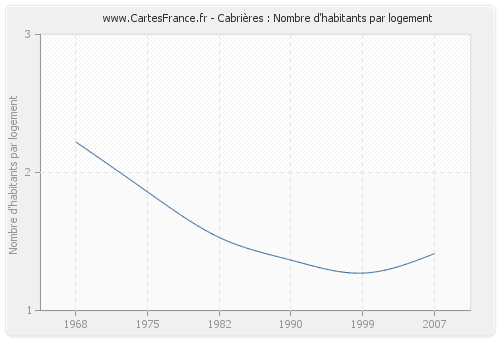 - Nombre d'habitants moyen par logement de Cabrières en 2007 : 1,41