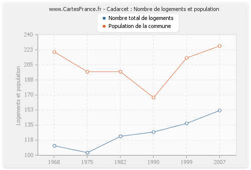 La population de Cadarcet était de 227 habitants en 2007, 213 habitants en 1999, 167 habitants en 1990, 197 habitants en 1982, 197 habitants en 1975 et 220 habitants en 1968. Parallèlement, le nombre de logements de Cadarcet était de 152 en 2007, 137 en 1999, 127 en 1990, 122 en 1982, 103 en 1975 et 111 en 1968.