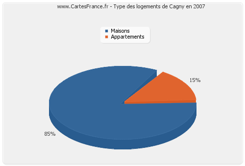 En 2007 les logements de Cagny étaient composés de 540 résidences principales, 0 résidences secondaires ou occasionnels ainsi que 13 logements vacants.