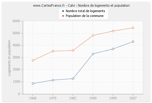 La population de Calvi était de 5 441 habitants en 2007, 5 178 habitants en 1999, 4 815 habitants en 1990, 3 579 habitants en 1982, 3 530 habitants en 1975 et 2 767 habitants en 1968. Parallèlement, le nombre de logements de Calvi était de 4 309 en 2007, 3 710 en 1999, 3 302 en 1990, 1 265 en 1982, 1 151 en 1975 et 869 en 1968.