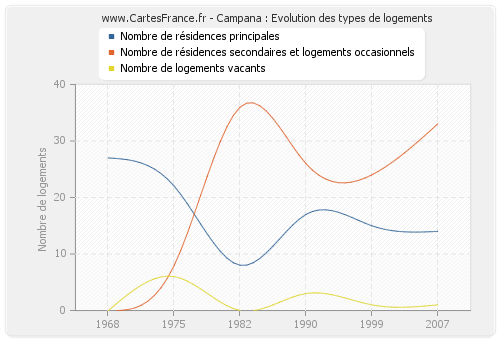 En 2007 les logements de Campana étaient composés de 14 résidences principales, 33 résidences secondaires ou occasionnels ainsi que 1 logements vacants.