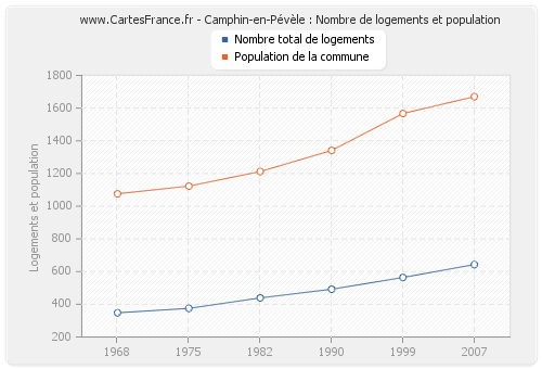 La population de Camphin-en-Pévèle était de 1 670 habitants en 2007, 1 567 habitants en 1999, 1 341 habitants en 1990, 1 212 habitants en 1982, 1 123 habitants en 1975 et 1 076 habitants en 1968. Parallèlement, le nombre de logements de Camphin-en-Pévèle était de 643 en 2007, 564 en 1999, 492 en 1990, 439 en 1982, 375 en 1975 et 348 en 1968.