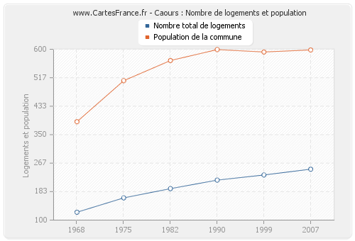 La population de Caours était de 598 habitants en 2007, 592 habitants en 1999, 599 habitants en 1990, 567 habitants en 1982, 508 habitants en 1975 et 388 habitants en 1968. Parallèlement, le nombre de logements de Caours était de 249 en 2007, 232 en 1999, 217 en 1990, 192 en 1982, 165 en 1975 et 123 en 1968.