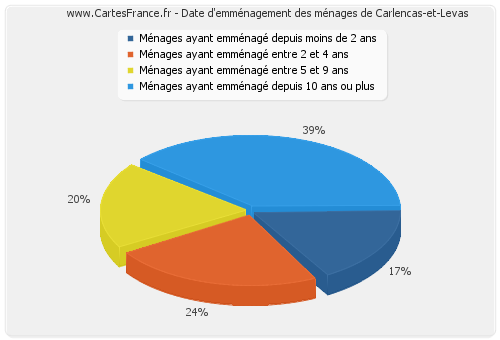 - Nombre de ménages de Carlencas-et-Levas ayant emménagé depuis 10 ans ou plus : 18