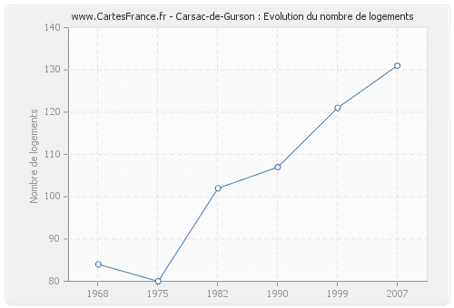 Le nombre de logements de Carsac-de-Gurson était de 131 en 2007, 121 en 1999, 107 en 1990, 102 en 1982, 80 en 1975 et 84 en 1968.