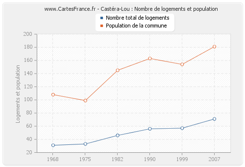 La population de Castéra-Lou était de 181 habitants en 2007, 154 habitants en 1999, 163 habitants en 1990, 145 habitants en 1982, 99 habitants en 1975 et 108 habitants en 1968. Parallèlement, le nombre de logements de Castéra-Lou était de 71 en 2007, 57 en 1999, 56 en 1990, 46 en 1982, 33 en 1975 et 31 en 1968.