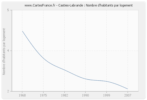 - Nombre d'habitants moyen par logement de Casties-Labrande en 2007 : 2,09