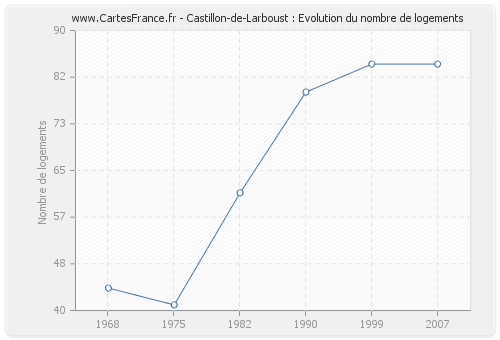 Le nombre de logements de Castillon-de-Larboust était de 84 en 2007, 84 en 1999, 79 en 1990, 61 en 1982, 41 en 1975 et 44 en 1968.