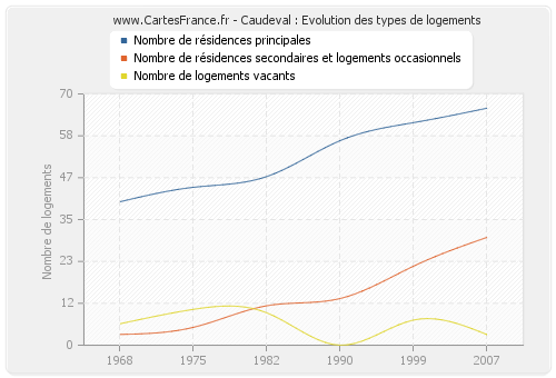 Les graphiques suivant reprennent l'historique du nombre et du type de logements de Caudeval de 1968 à 2007. Le deuxième graphique est tracé en interpolation cubique. Ceci permet d'obtenir plus précisément le nombre de logement du village de Caudeval les années ou aucun recensement n'a été effectué.