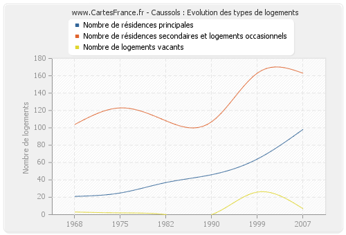 Les graphiques suivant reprennent l'historique du nombre et du type de logements de Caussols de 1968 à 2007. Le deuxième graphique est tracé en interpolation cubique. Ceci permet d'obtenir plus précisément le nombre de logement du village de Caussols les années ou aucun recensement n'a été effectué.
