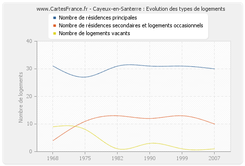 En 2007 les logements de Cayeux-en-Santerre étaient composés de 30 résidences principales, 10 résidences secondaires ou occasionnels ainsi que 1 logements vacants.