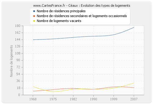 Les graphiques suivant reprennent l'historique du nombre et du type de logements de Céaux de 1968 à 2007. Le deuxième graphique est tracé en interpolation cubique. Ceci permet d'obtenir plus précisément le nombre de logement du village de Céaux les années ou aucun recensement n'a été effectué.