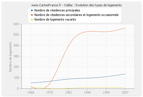 Les graphiques suivant reprennent l'historique du nombre et du type de logements de Ceillac de 1968 à 2007. Le deuxième graphique est tracé en interpolation cubique. Ceci permet d'obtenir plus précisément le nombre de logement du village de Ceillac les années ou aucun recensement n'a été effectué.