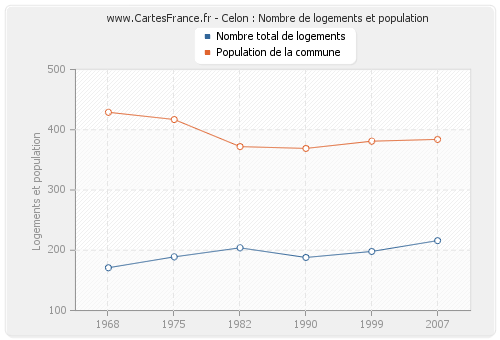 Le nombre de logements de Celon était de 216 en 2007, 198 en 1999, 188 en 1990, 204 en 1982, 189 en 1975 et 171 en 1968.