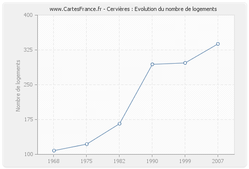 Le nombre de logements de Cervières était de 338 en 2007, 297 en 1999, 294 en 1990, 166 en 1982, 122 en 1975 et 108 en 1968.