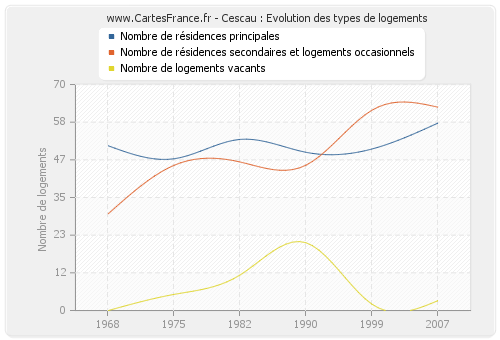 Les graphiques suivant reprennent l'historique du nombre et du type de logements de Cescau de 1968 à 2007. Le deuxième graphique est tracé en interpolation cubique. Ceci permet d'obtenir plus précisément le nombre de logement du village de Cescau les années ou aucun recensement n'a été effectué.