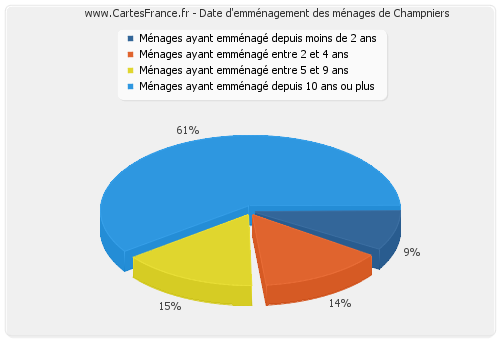 - Nombre de ménages de Champniers ayant emménagé depuis 10 ans ou plus : 1 227