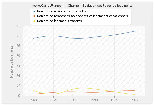 En 2007 les logements de Champs étaient composés de 111 résidences principales, 9 résidences secondaires ou occasionnels ainsi que 2 logements vacants.