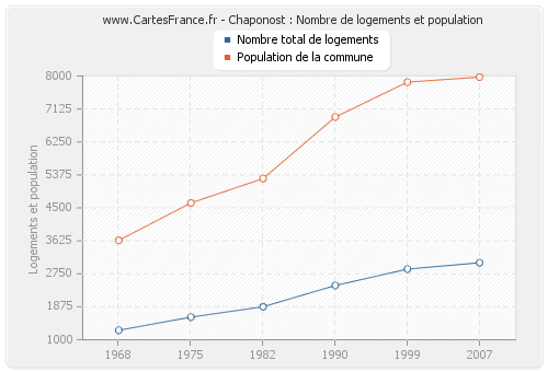 La population de Chaponost était de 7 972 habitants en 2007, 7 838 habitants en 1999, 6 911 habitants en 1990, 5 278 habitants en 1982, 4 632 habitants en 1975 et 3 638 habitants en 1968. Parallèlement, le nombre de logements de Chaponost était de 3 043 en 2007, 2 875 en 1999, 2 439 en 1990, 1 875 en 1982, 1 600 en 1975 et 1 251 en 1968.