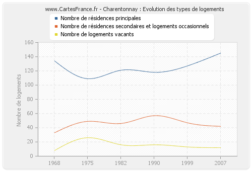 Les graphiques suivant reprennent l'historique du nombre et du type de logements de Charentonnay de 1968 à 2007. Le deuxième graphique est tracé en interpolation cubique. Ceci permet d'obtenir plus précisément le nombre de logement du village de Charentonnay les années ou aucun recensement n'a été effectué.