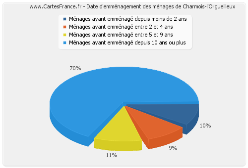 - Nombre de ménages de Charmois-l'Orgueilleux ayant emménagé depuis 10 ans ou plus : 140