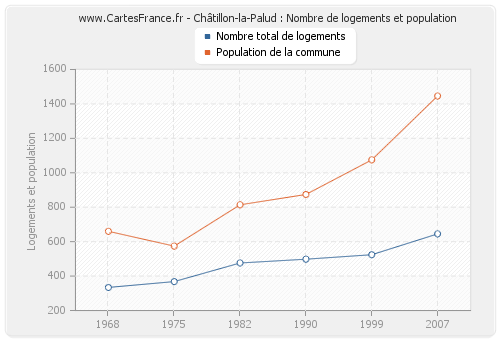 La population de Châtillon-la-Palud était de 1 446 habitants en 2007, 1 075 habitants en 1999, 874 habitants en 1990, 814 habitants en 1982, 574 habitants en 1975 et 660 habitants en 1968. Parallèlement, le nombre de logements de Châtillon-la-Palud était de 645 en 2007, 524 en 1999, 498 en 1990, 476 en 1982, 368 en 1975 et 334 en 1968.