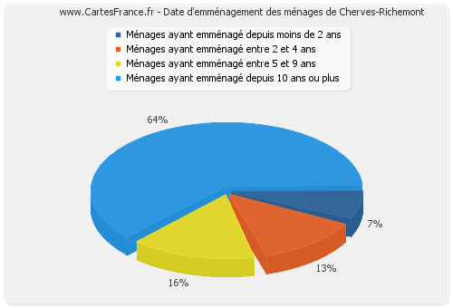 - Nombre de ménages de Cherves-Richemont ayant emménagé depuis 10 ans ou plus : 645