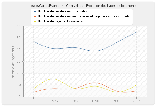 En 2007 les logements de Chervettes étaient composés de 55 résidences principales, 5 résidences secondaires ou occasionnels ainsi que 10 logements vacants.