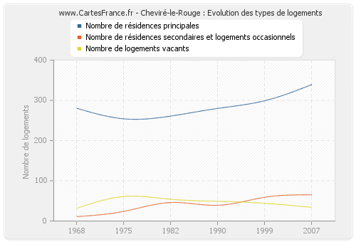 Les graphiques suivant reprennent l'historique du nombre et du type de logements de Cheviré-le-Rouge de 1968 à 2007. Le deuxième graphique est tracé en interpolation cubique. Ceci permet d'obtenir plus précisément le nombre de logement du village de Cheviré-le-Rouge les années ou aucun recensement n'a été effectué.
