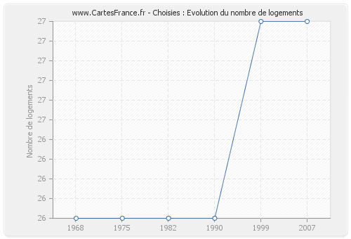 Le nombre de logements de Choisies était de 27 en 2007, 27 en 1999, 26 en 1990, 26 en 1982, 26 en 1975 et 26 en 1968.