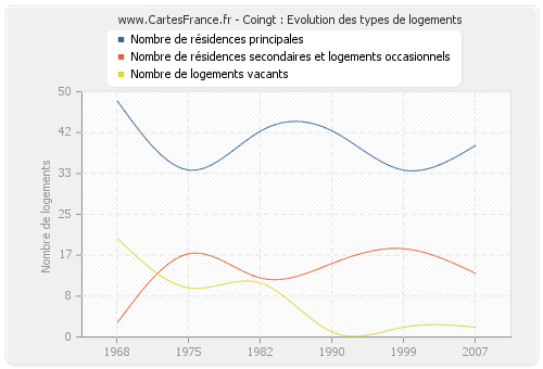 En 2007 les logements de Coingt étaient composés de 39 résidences principales, 13 résidences secondaires ou occasionnels ainsi que 2 logements vacants.
