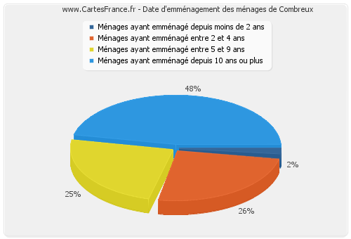 - Nombre de ménages de Combreux ayant emménagé depuis 10 ans ou plus : 48