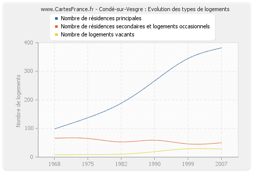 Les graphiques suivant reprennent l'historique du nombre et du type de logements de Condé-sur-Vesgre de 1968 à 2007. Le deuxième graphique est tracé en interpolation cubique. Ceci permet d'obtenir plus précisément le nombre de logement du village de Condé-sur-Vesgre les années ou aucun recensement n'a été effectué.