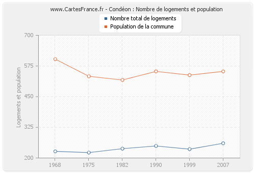 La population de Condéon était de 553 habitants en 2007, 538 habitants en 1999, 553 habitants en 1990, 518 habitants en 1982, 533 habitants en 1975 et 603 habitants en 1968. Parallèlement, le nombre de logements de Condéon était de 260 en 2007, 236 en 1999, 249 en 1990, 238 en 1982, 222 en 1975 et 227 en 1968.