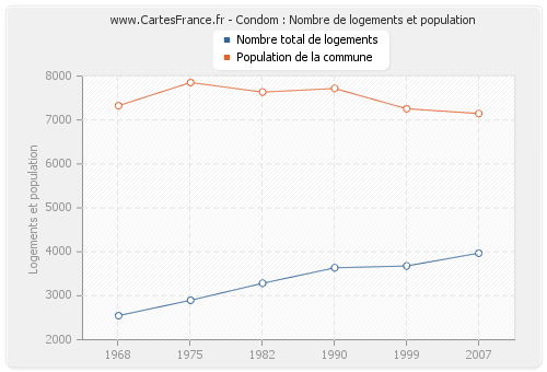 La population de Condom était de 7 147 habitants en 2007, 7 256 habitants en 1999, 7 717 habitants en 1990, 7 634 habitants en 1982, 7 853 habitants en 1975 et 7 326 habitants en 1968. Parallèlement, le nombre de logements de Condom était de 3 970 en 2007, 3 678 en 1999, 3 636 en 1990, 3 284 en 1982, 2 898 en 1975 et 2 549 en 1968.
