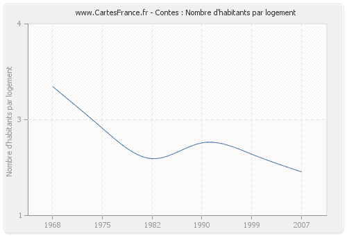 - Nombre d'habitants moyen par logement de Contes en 2007 : 1,68