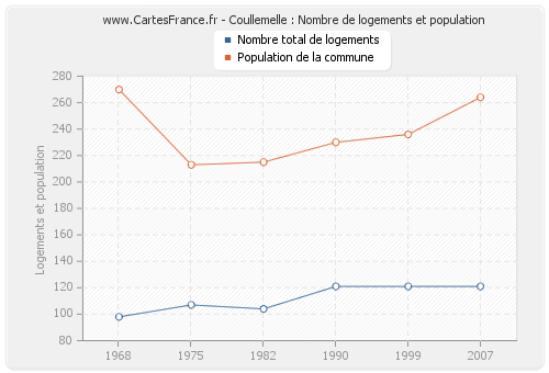 La population de Coullemelle était de 264 habitants en 2007, 236 habitants en 1999, 230 habitants en 1990, 215 habitants en 1982, 213 habitants en 1975 et 270 habitants en 1968. Parallèlement, le nombre de logements de Coullemelle était de 121 en 2007, 121 en 1999, 121 en 1990, 104 en 1982, 107 en 1975 et 98 en 1968.