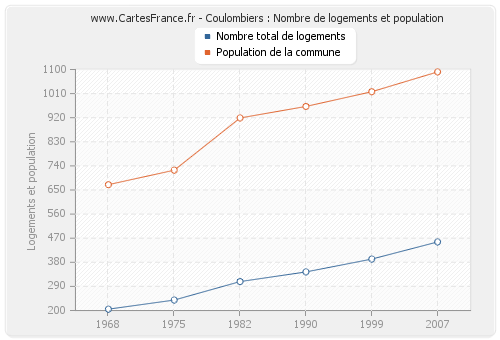 La population de Coulombiers était de 1 091 habitants en 2007, 1 017 habitants en 1999, 962 habitants en 1990, 919 habitants en 1982, 724 habitants en 1975 et 670 habitants en 1968. Parallèlement, le nombre de logements de Coulombiers était de 456 en 2007, 392 en 1999, 344 en 1990, 308 en 1982, 239 en 1975 et 205 en 1968.
