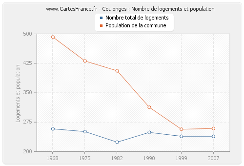 La population de Coulonges était de 259 habitants en 2007, 257 habitants en 1999, 313 habitants en 1990, 406 habitants en 1982, 431 habitants en 1975 et 492 habitants en 1968. Parallèlement, le nombre de logements de Coulonges était de 239 en 2007, 239 en 1999, 249 en 1990, 224 en 1982, 251 en 1975 et 258 en 1968.