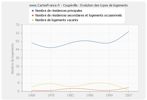 En 2007 les logements de Coupéville étaient composés de 63 résidences principales, 4 résidences secondaires ou occasionnels ainsi que 1 logements vacants.