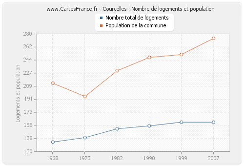 La population de Courcelles était de 274 habitants en 2007, 252 habitants en 1999, 248 habitants en 1990, 230 habitants en 1982, 195 habitants en 1975 et 213 habitants en 1968. Parallèlement, le nombre de logements de Courcelles était de 160 en 2007, 160 en 1999, 155 en 1990, 151 en 1982, 139 en 1975 et 133 en 1968.